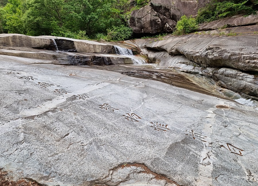 송암계곡 바위에 거침없이 매끈하게 새겨진 吾家無寶物 寶物惟淸白(오가 무보물 보물 유청백)