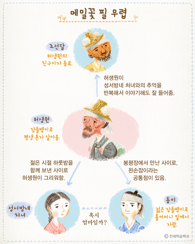 • 성서방네 처녀 : 젊은 시절 허생원과 하룻밤을 지낸 사이로, 허생원이 평생 그리워하는 인물이에요.